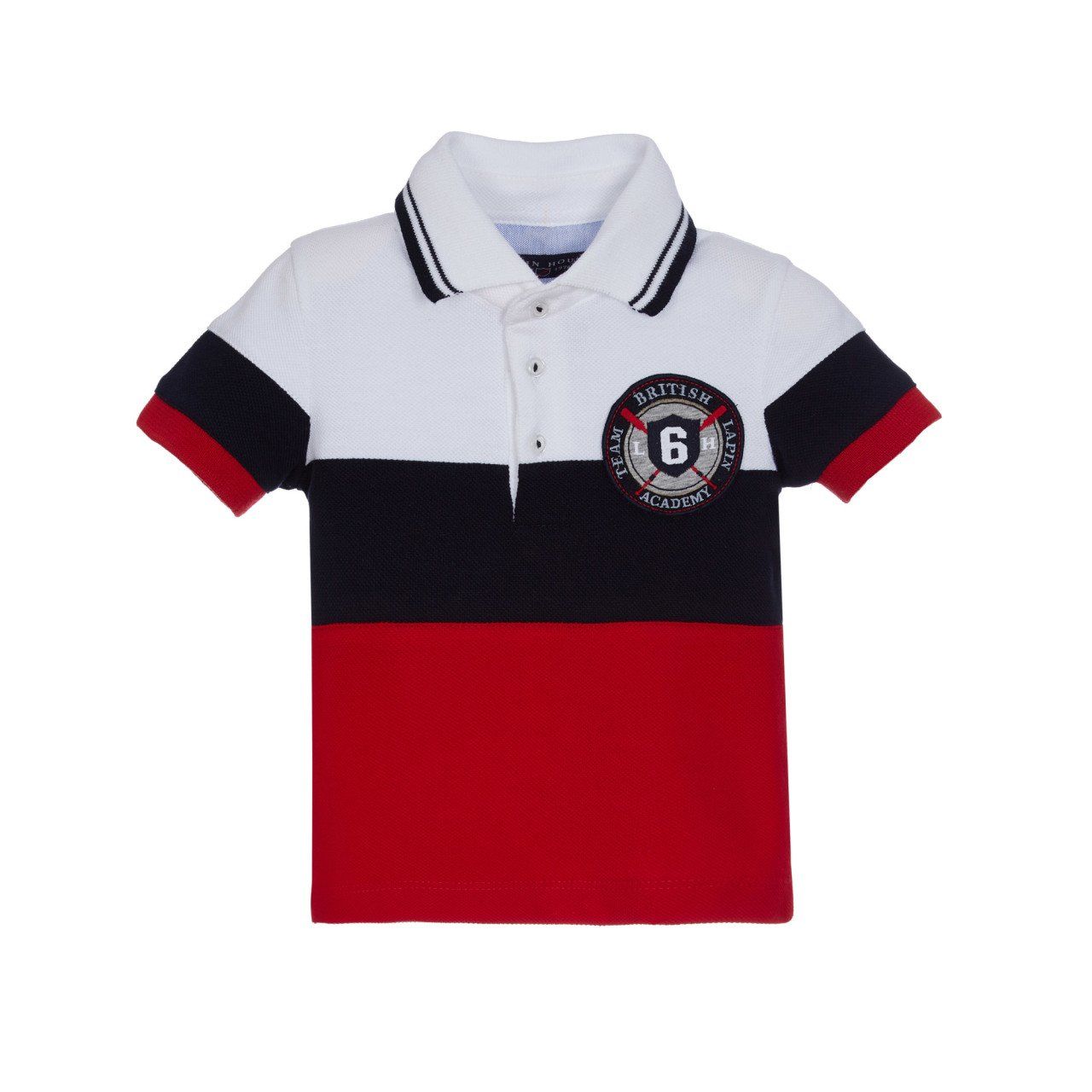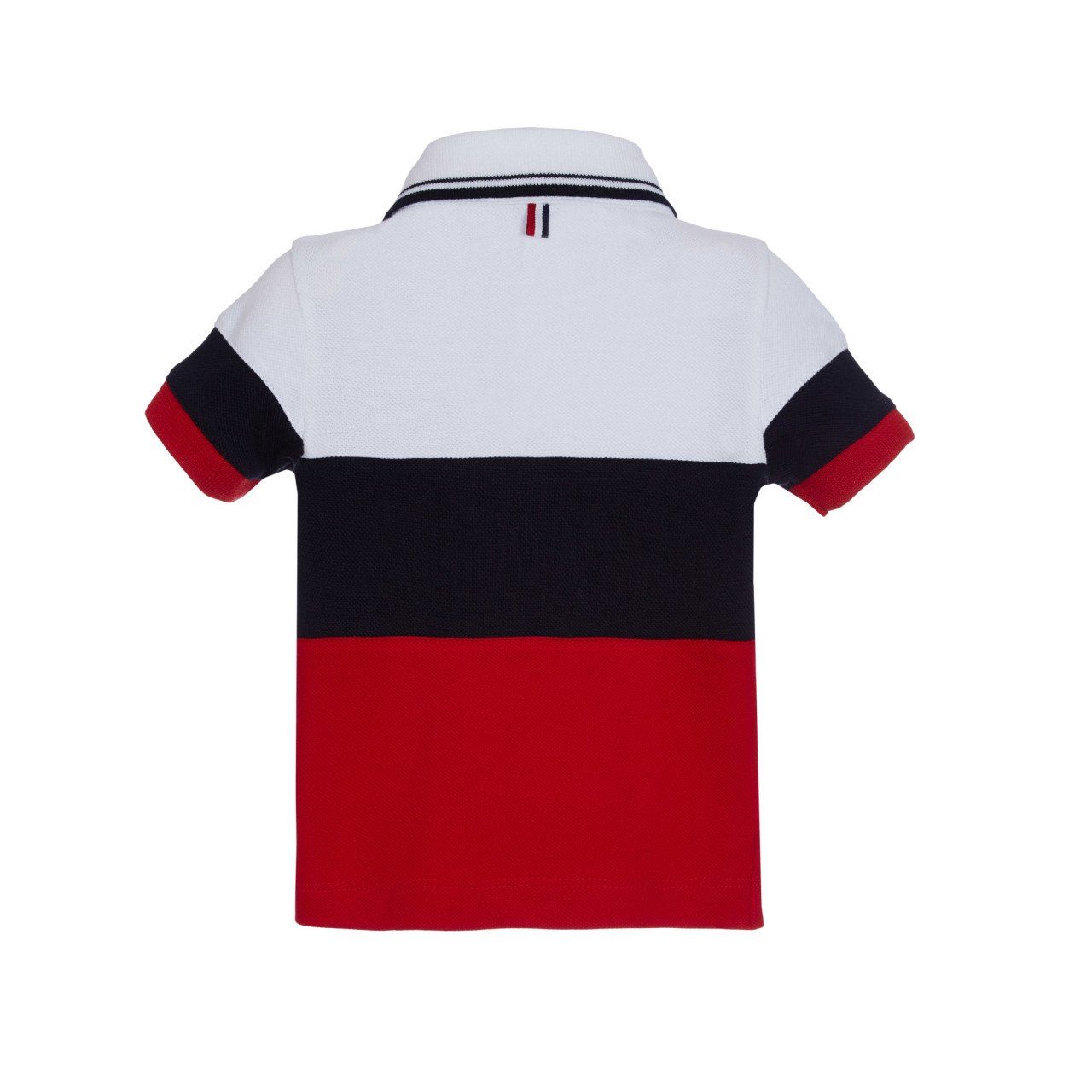 - Düğme çizgisi boyunca lacivert-kırmızı şerit detaylı, polo yaka tshirt.