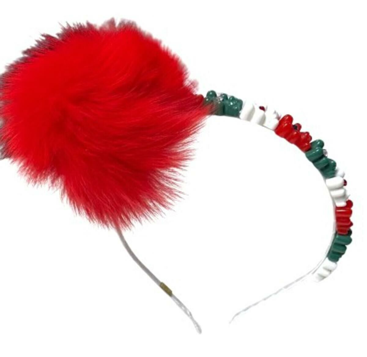 - Taşlı ayıcık ve kırmızı tüylü ponpon detaylı saç bandı.