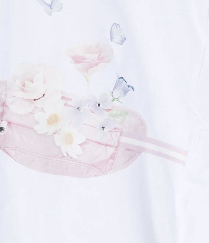 - Beyaz renkte, ön tarafta çiçek ve kelebek detaylı bel çantası baskılı