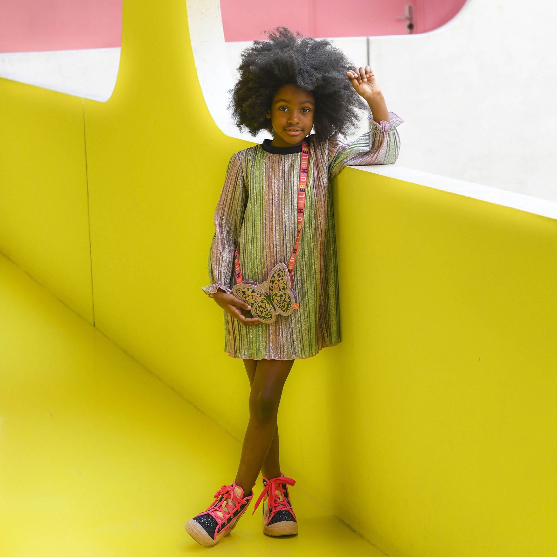 - Bilekleri fırfır detaylı, simli, plise elbise.