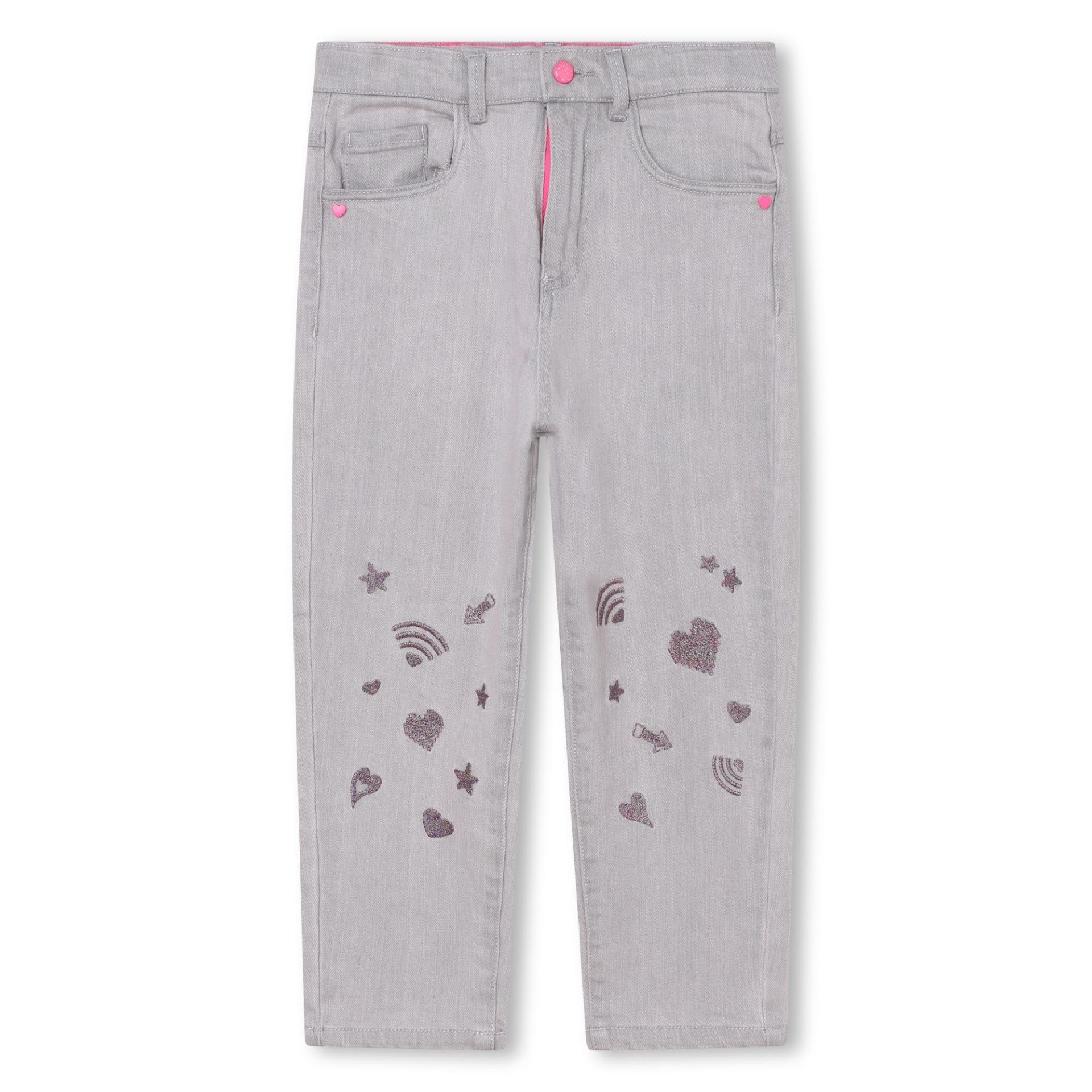 - Cep altları minik pembe kalp detaylı, hafif bol kesim kot pantolon.