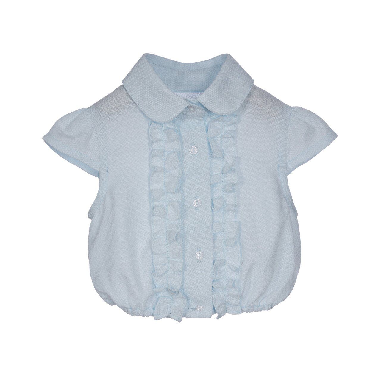 - Yeşile dönük beyaz renkte, bebe yaka, ön tarafında fırfır detaylı, önden düğme kapatmalı
