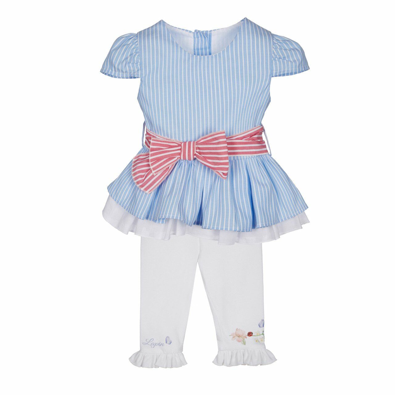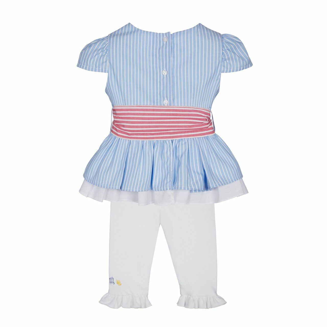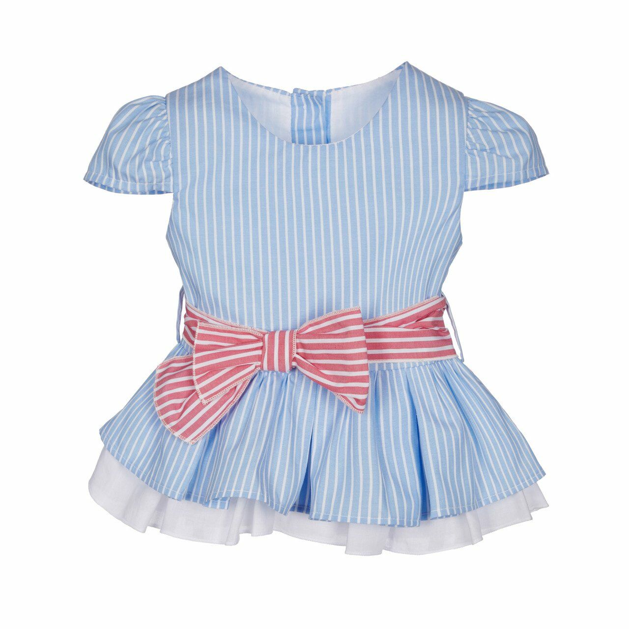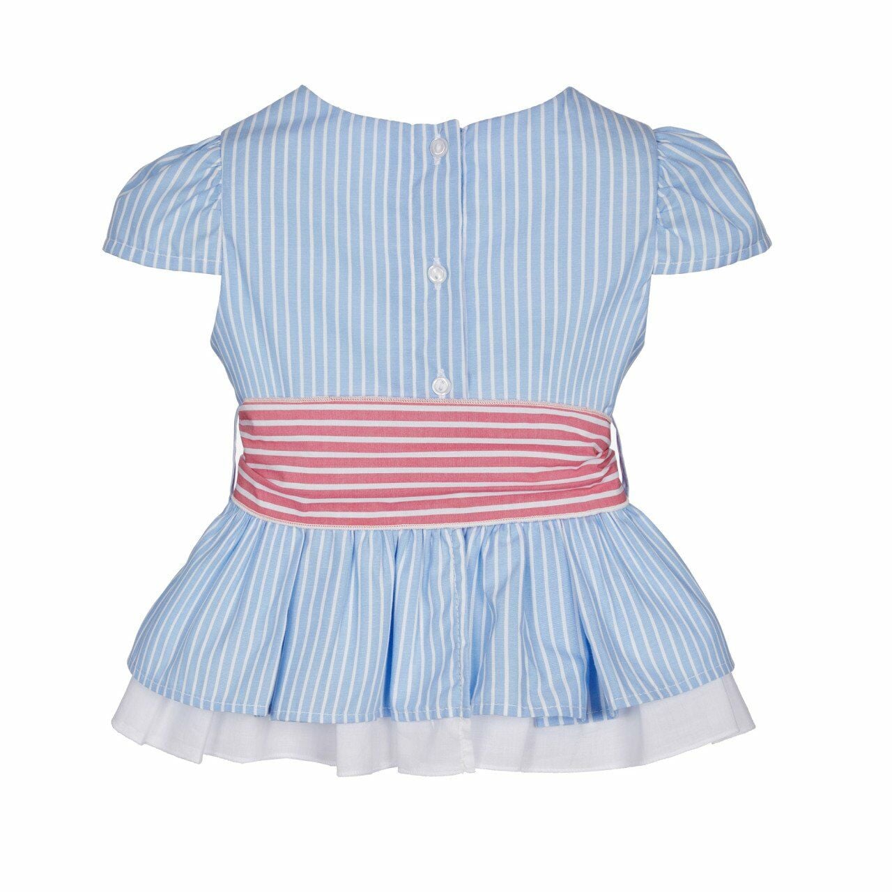 - Mavi-beyaz çizgili, çift kat etekli, pembe-beyaz çizgili fiyonklu kuşak detaylı, arkadan düğme kapatmalı, kısa kollu, peplum model gömlek
