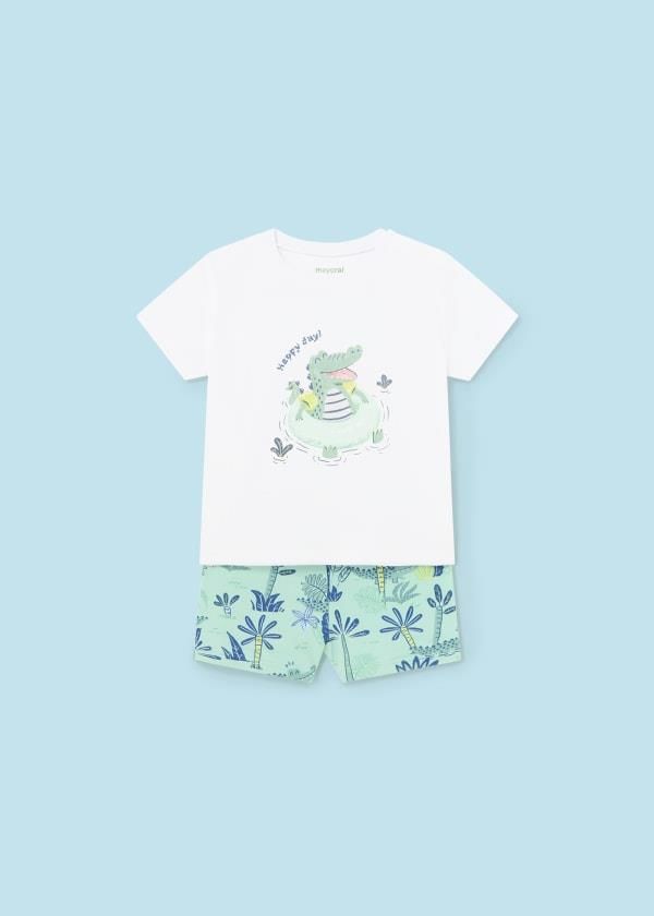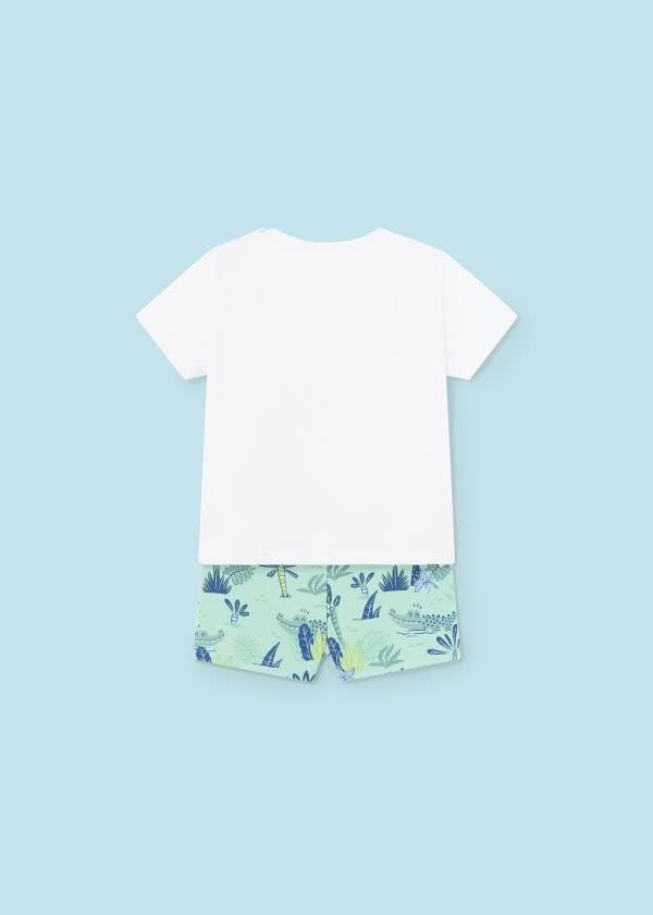 - Yeşil renkte, mavi-sarı-yeşil tonlarda timsah tema desenli şort mayo.