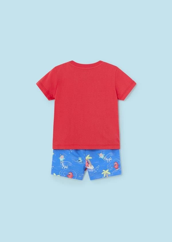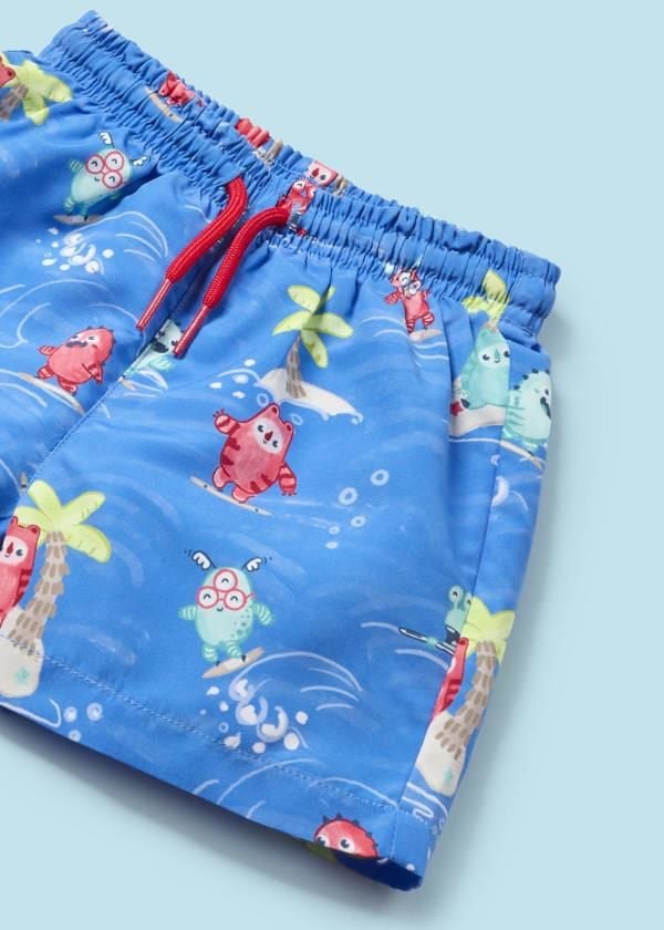 - Mavi renkte, suda yüzen minik canavarlar tema desenli şort mayo.