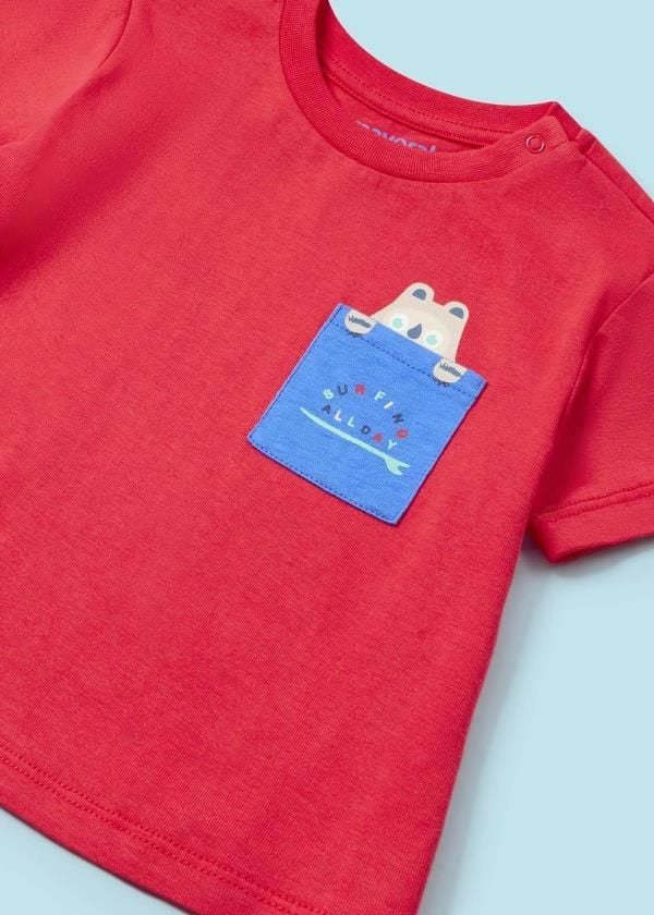 - Kırmızı renkte, minik canavarlı cep detaylı, omuzdan çıtçıt düğme kapatmalı, bisiklet yaka T-shirt