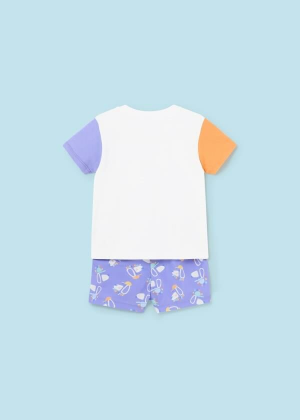 - Maviye dönük mor renkte, köpekcik desenli şort mayo.