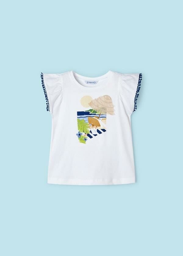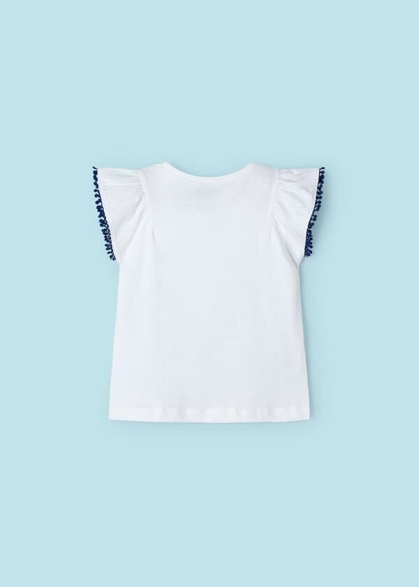 - Omuzları büzgülü, kolları lacivert ip detaylı, bisiklet yaka T-shirt.
