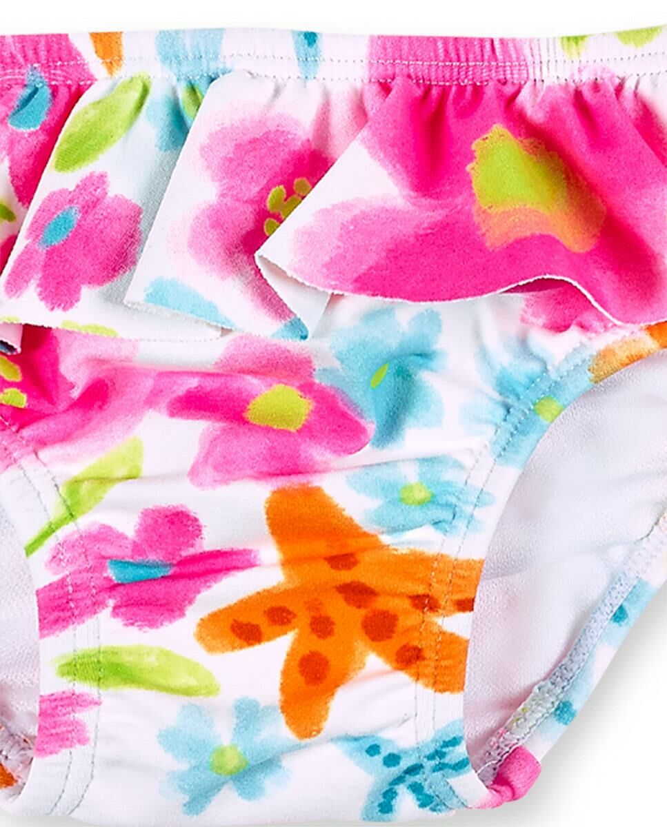 - Beyaz üstüne renkli deniz yıldızı ve çiçek desenli, fırfır detaylı mayo.