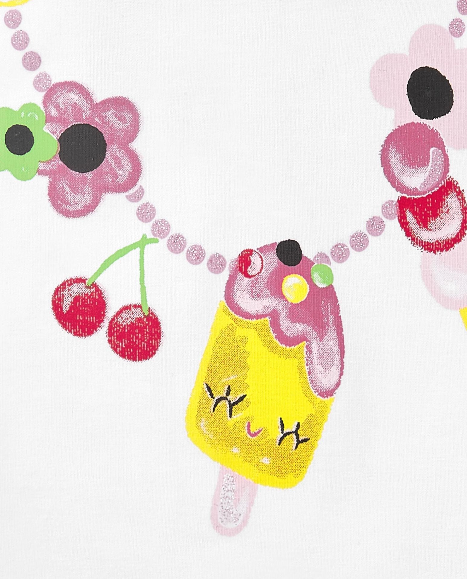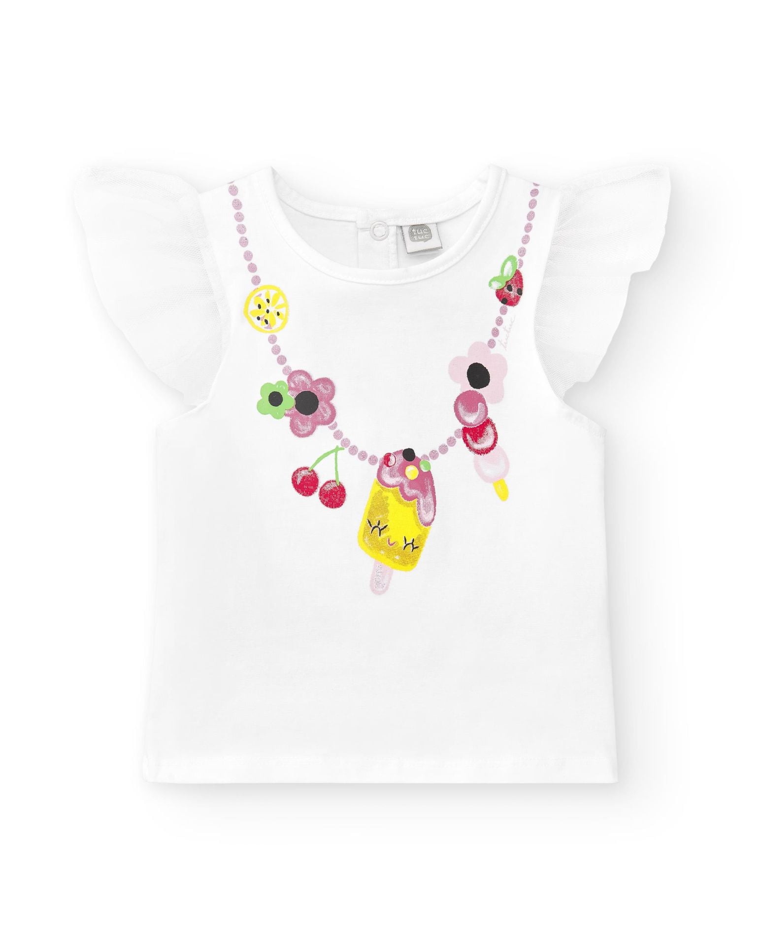 Beyaz renkte, ön tarafı meyveli ve çiçekli kolye baskılı