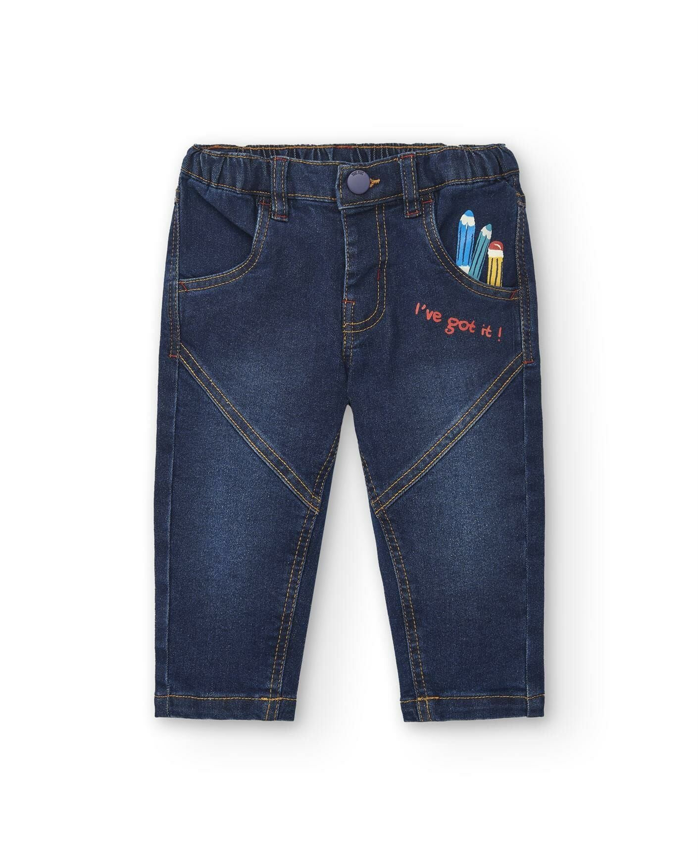 - Cep kısmı yazı ve renkli kalem baskılı, düğmeli, beli lastikli, kot pantolon.