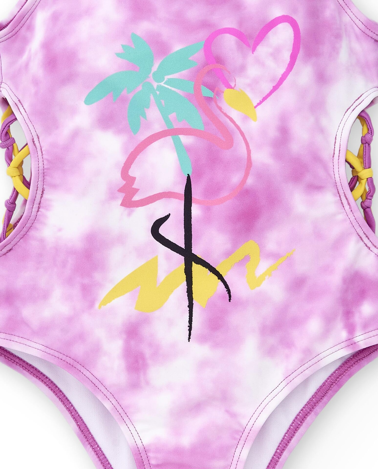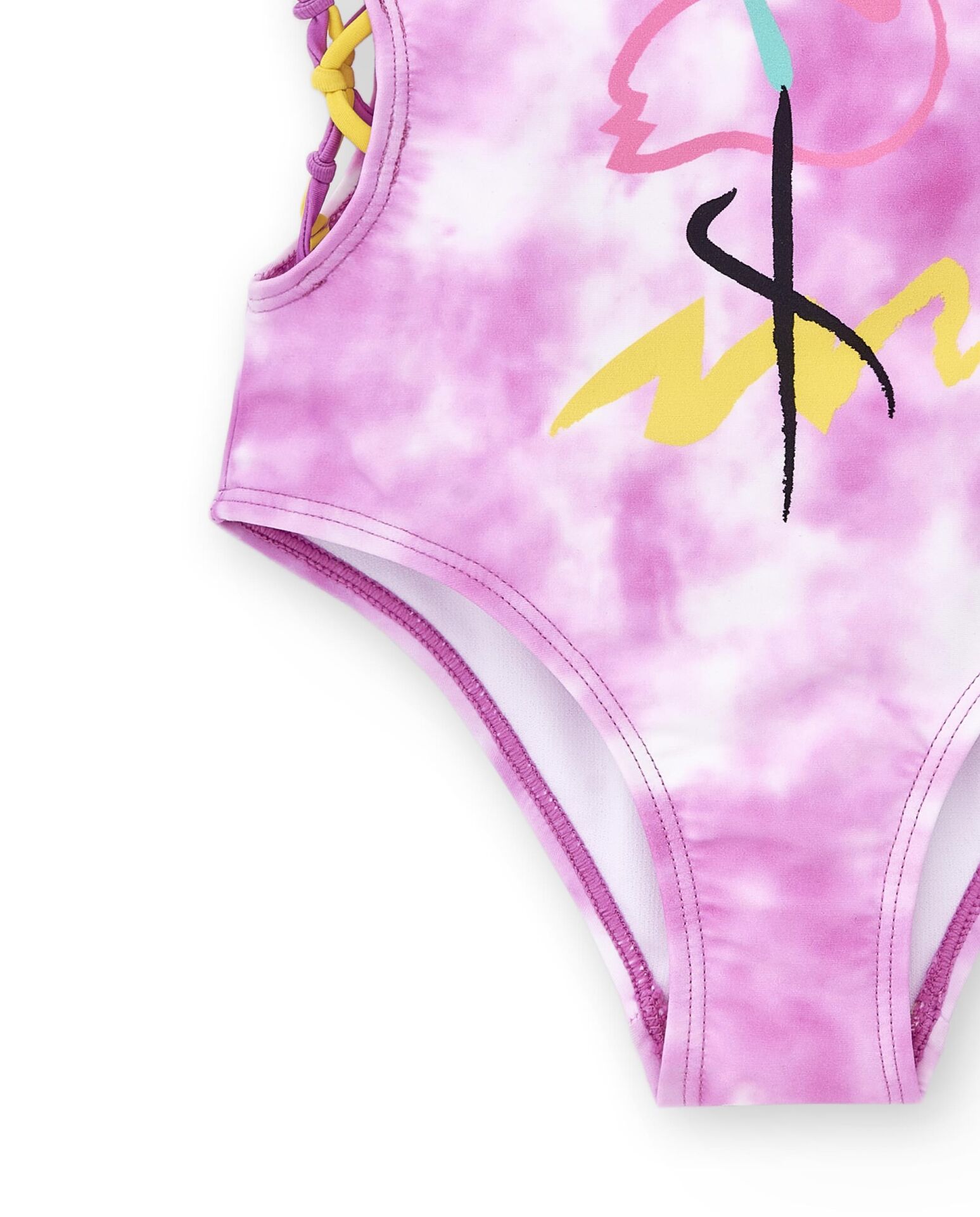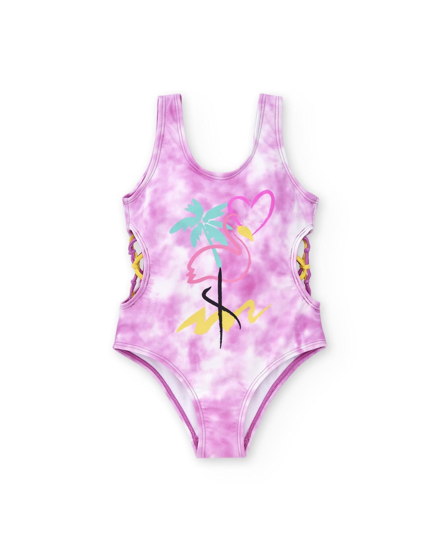 - Yanları dekolteli ve pembe - sarı ip detaylı mayo.