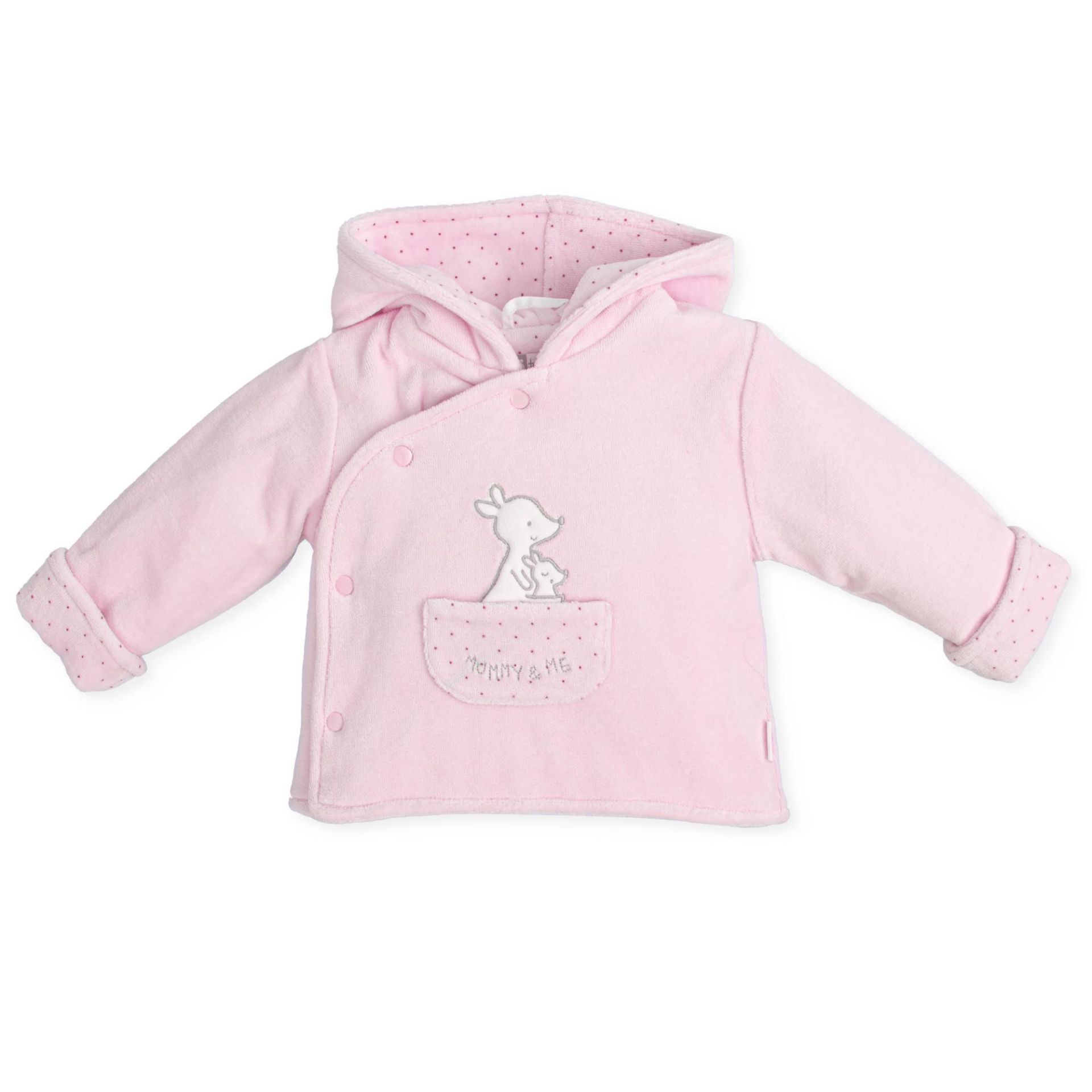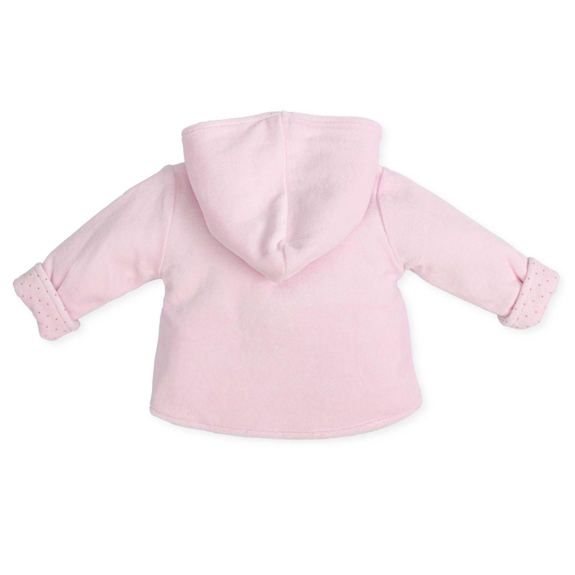 - Pembe renkte, kadife dokuda, cepte - bileklerde ve kapüşon içinde puantiye detaylı
