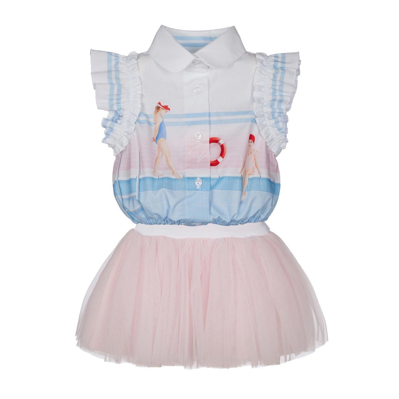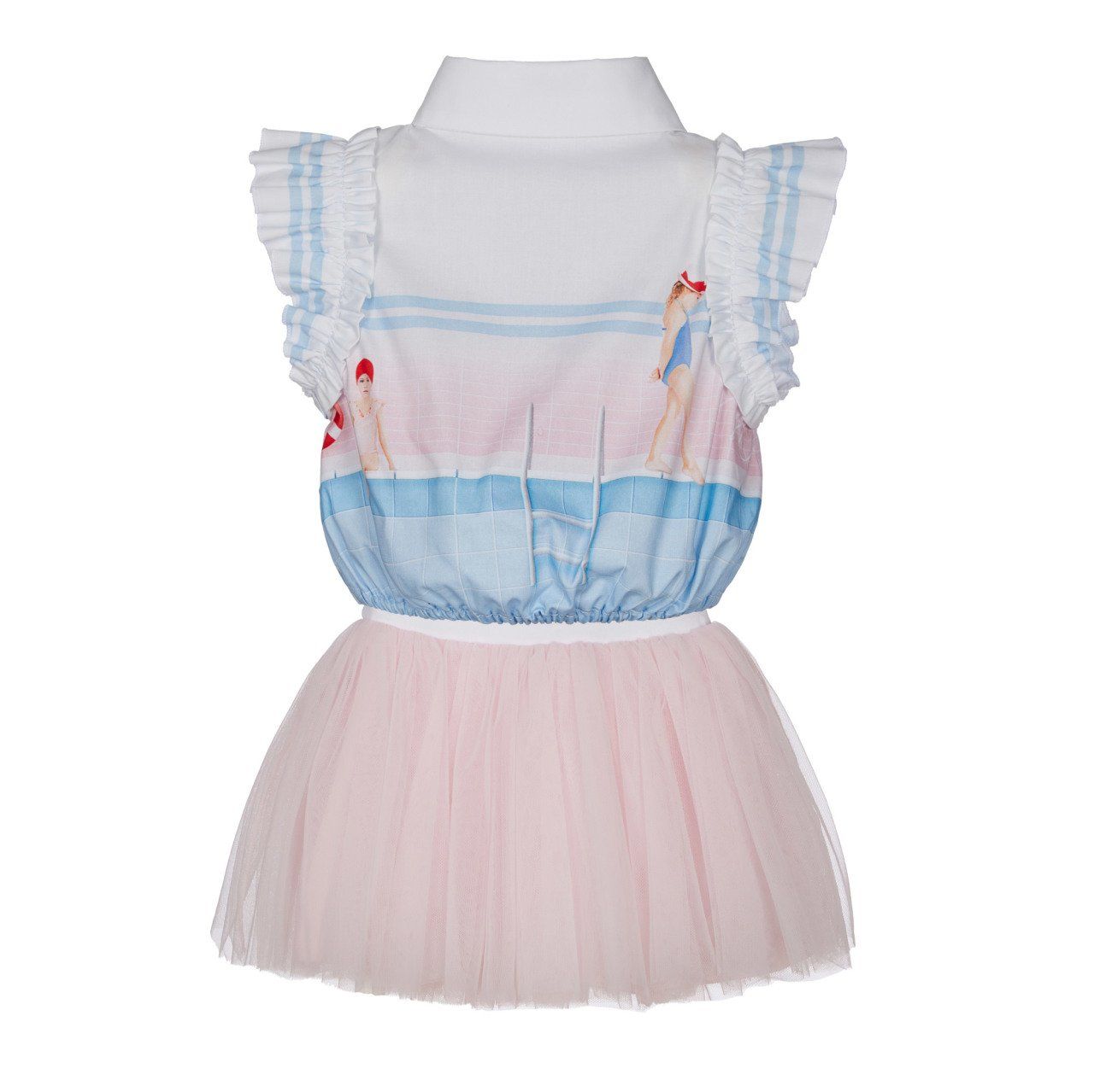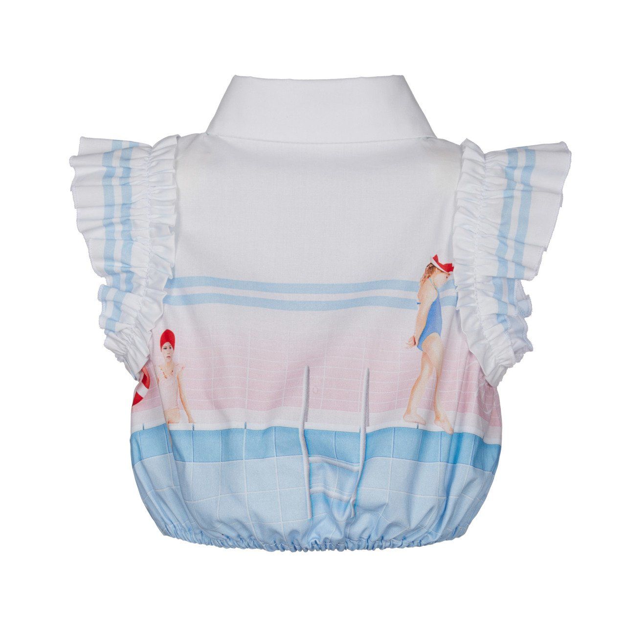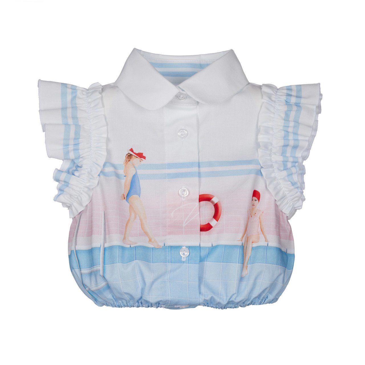 - Beyaz üstüne pembe-mavi tonlarda havuz ve kız çocuk baskılı, omuzlarda fırfır ve mavi şerit detaylı, önden düğme kapatmalı, beli lastikli, kısa gömlek.